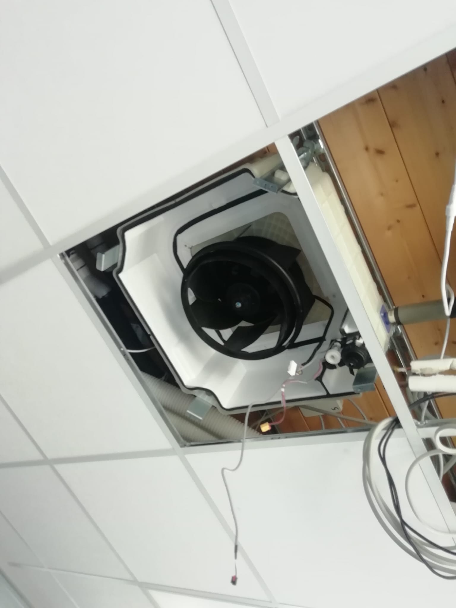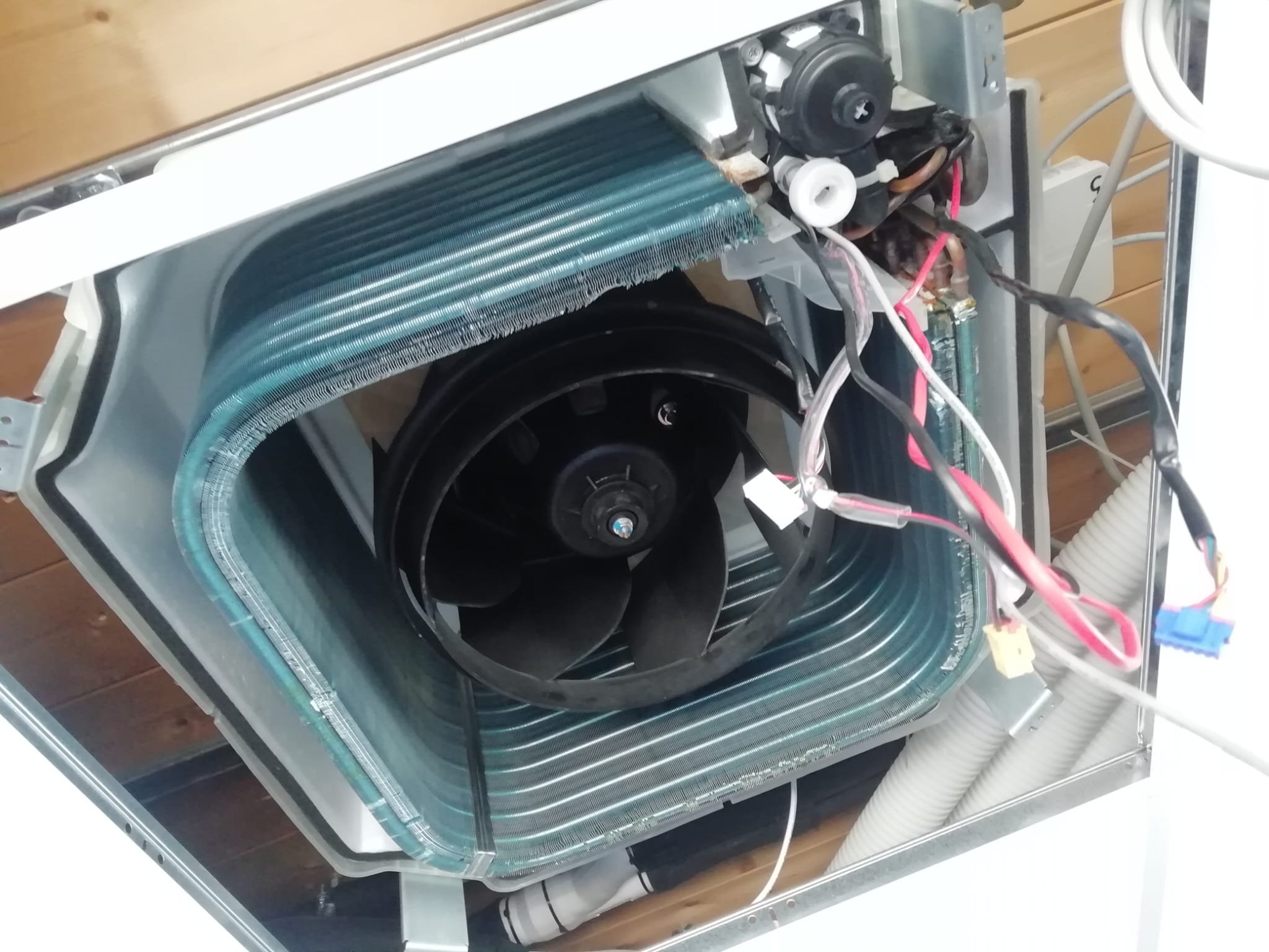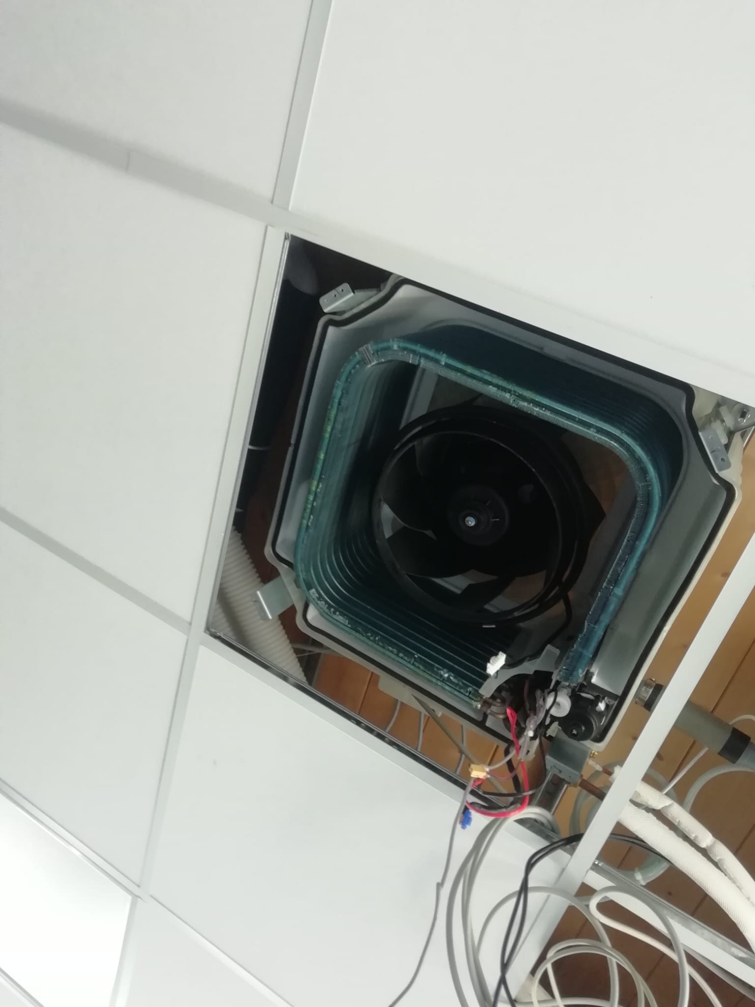 Nach einer gründlichen Fehlersuche zeigte sich die Ursache: Der Verdampfer in einem der Decken-Innengeräte (Kassettenbauweise) war undicht. Durch den Kältemittelverlust konnte das Gerät keine Kühlleistung mehr aufbauen.
